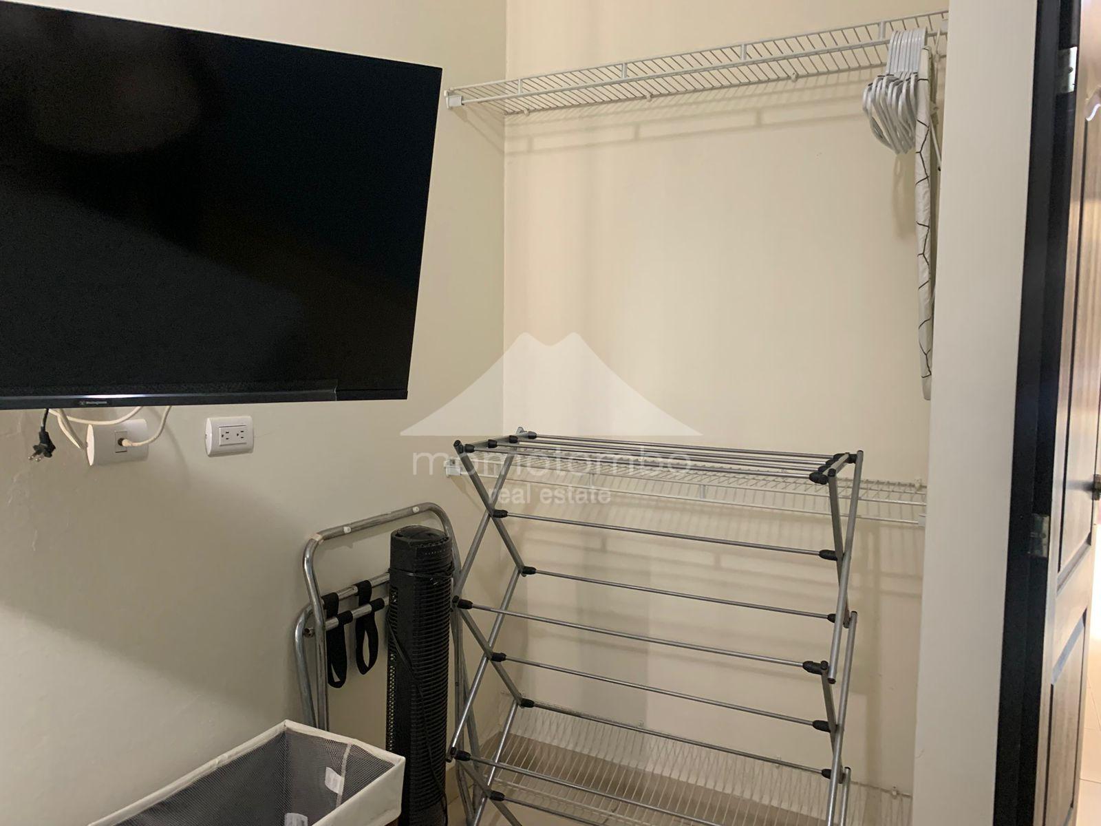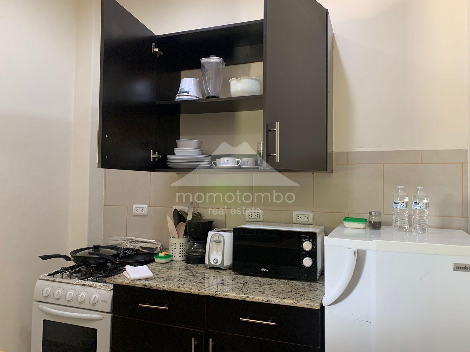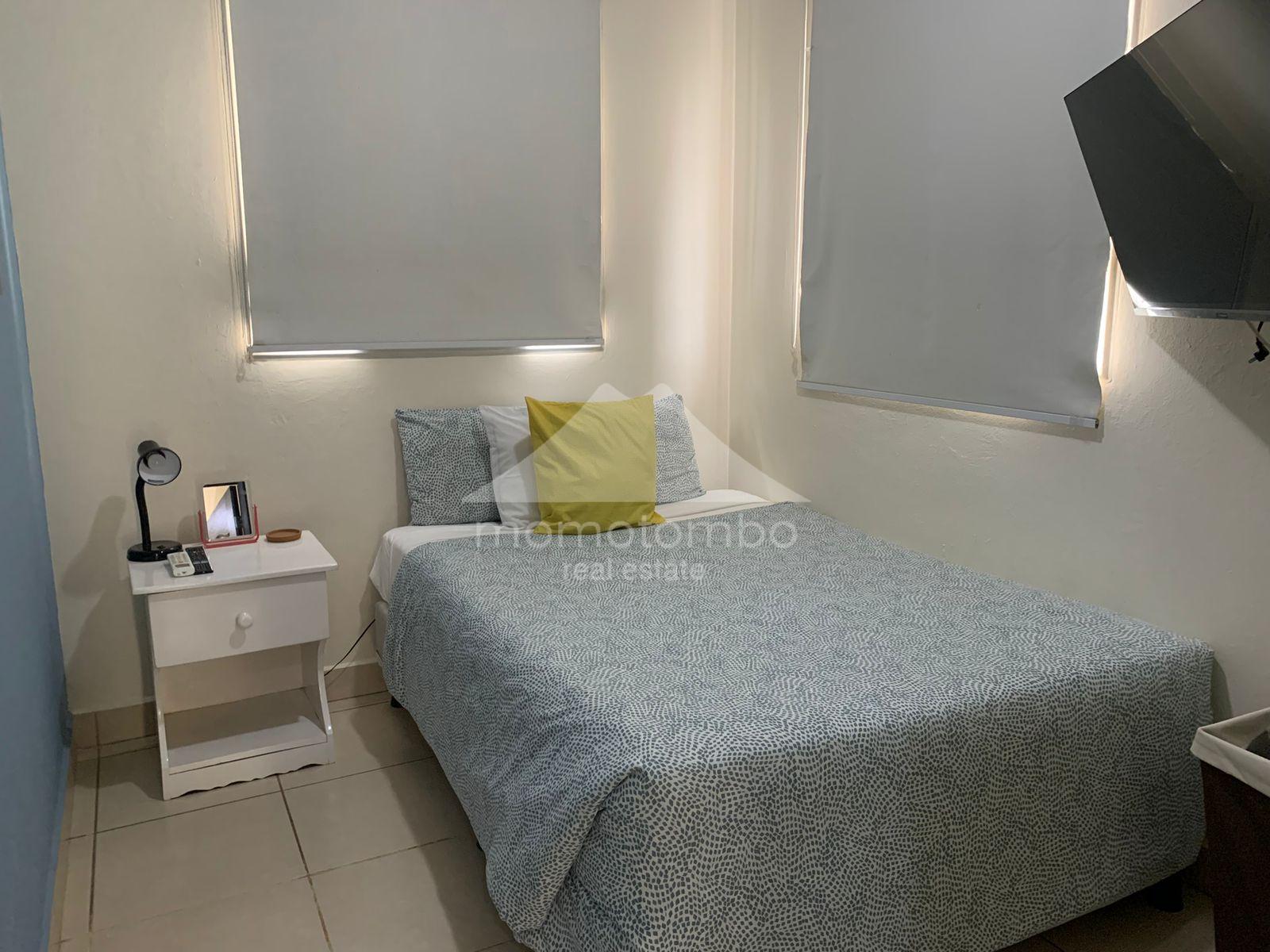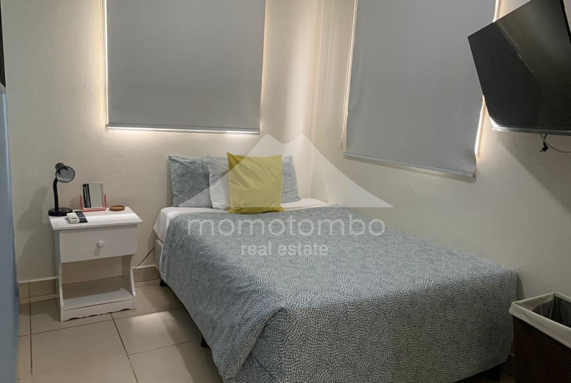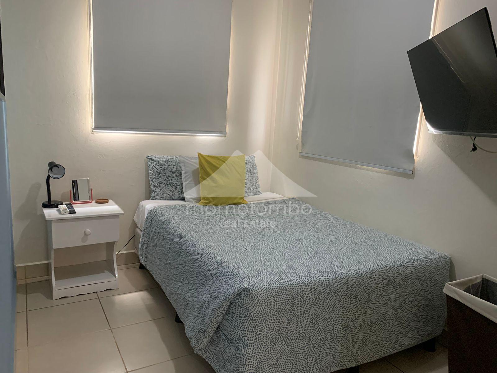 Apartamento céntrico y seguro de 29 mt2 para una persona o pareja, parcialmente amoblado y equipado, en complejo de apartamentos en Reparto San Juan, con portero y vigilancia 24/7, en el nuevo centro de Managua. Cuenta con 1 habitaciones con a/c, 1 baño y comedor-cocina con refrigerador, estufa, microondas, licuadora, cafetera, vajilla y utensilios de cocina. El precio incluye el consumo de agua, wifi, cable tv y estacionamiento seguro así como limpieza una vez por semana y cambio de ropa de cama. El complejo dispone de tanque de abastecimiento de agua. También ofrece el servicio de lavandería por U$5 y secado por U$5 dólares para un máximo de 20-24 piezas. El consumo de electricidad corre por cuenta del inquilino.