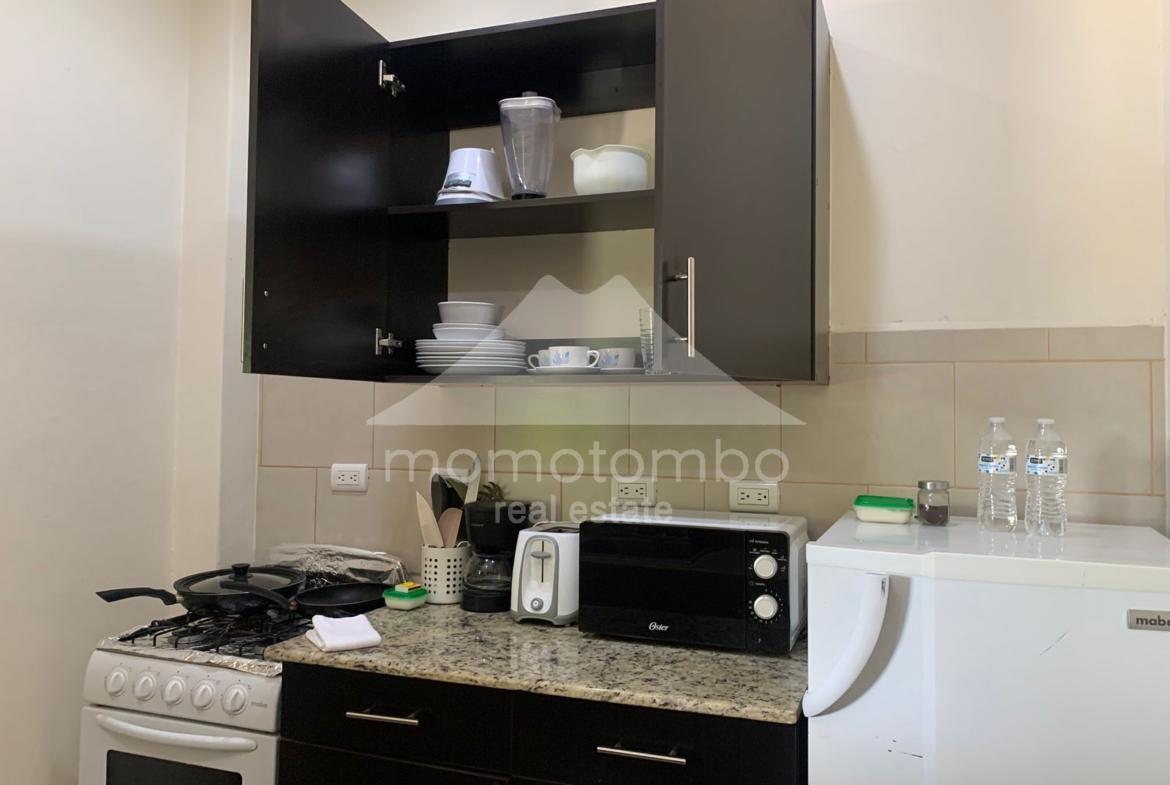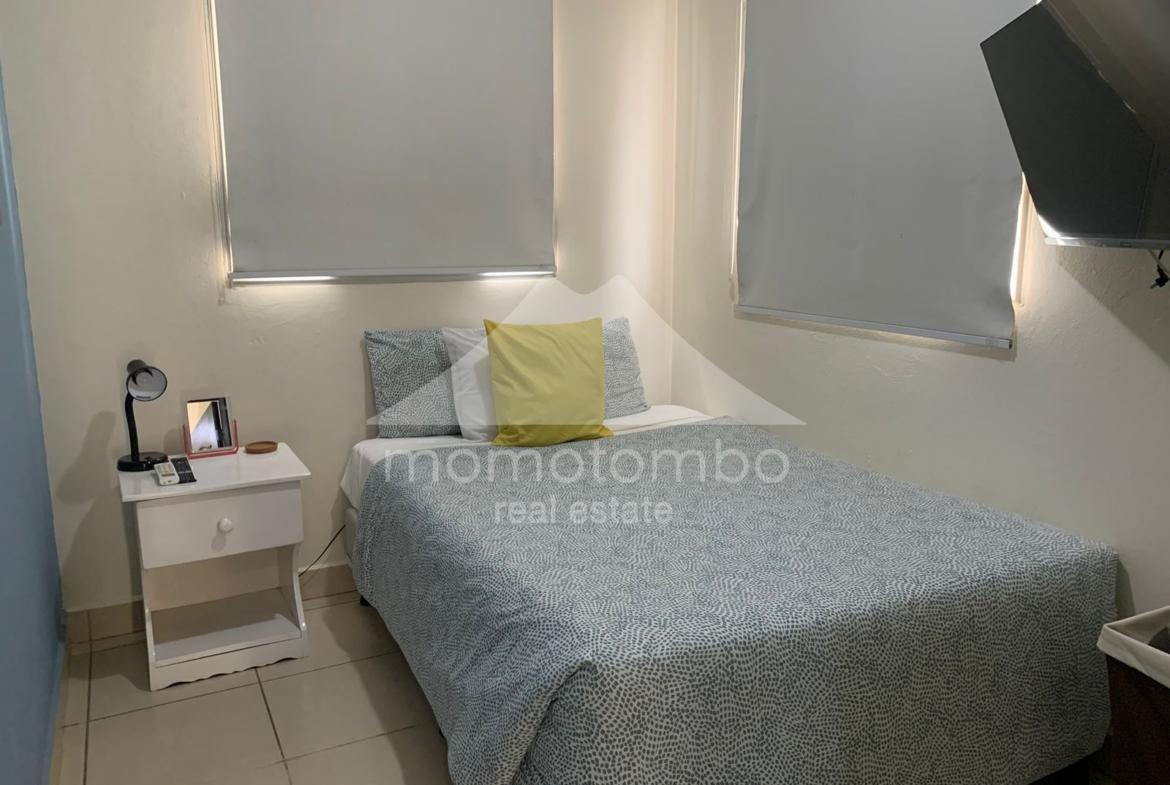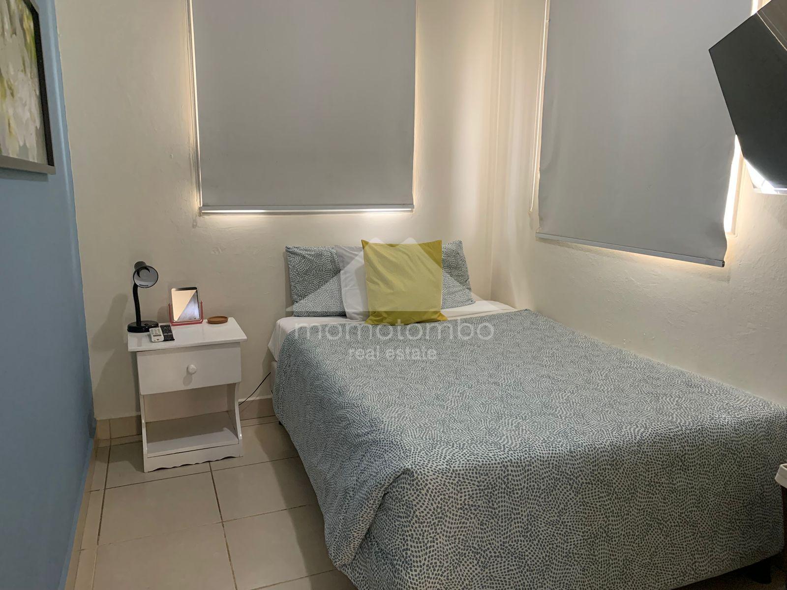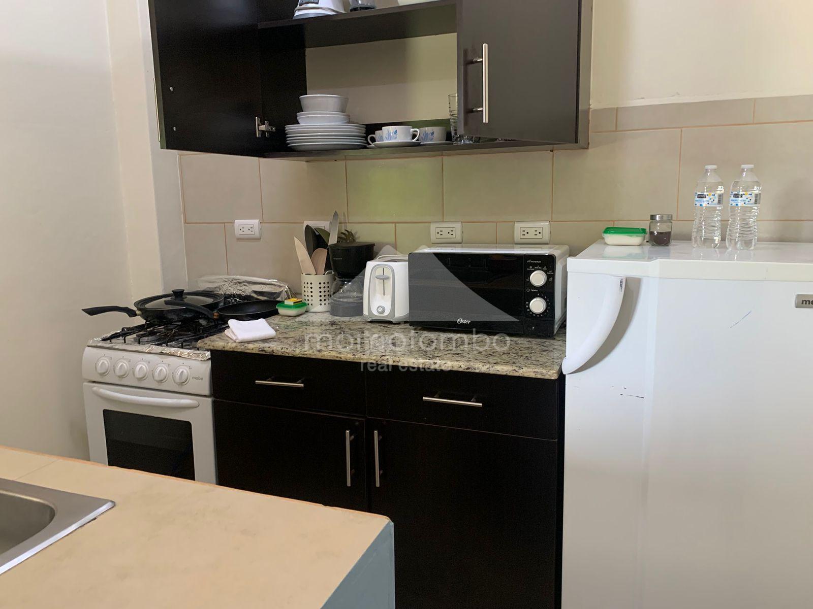 Apartamento céntrico y seguro de 29 mt2 para una persona o pareja, parcialmente amoblado y equipado, en complejo de apartamentos en Reparto San Juan, con portero y vigilancia 24/7, en el nuevo centro de Managua. Cuenta con 1 habitaciones con a/c, 1 baño y comedor-cocina con refrigerador, estufa, microondas, licuadora, cafetera, vajilla y utensilios de cocina. El precio incluye el consumo de agua, wifi, cable tv y estacionamiento seguro así como limpieza una vez por semana y cambio de ropa de cama. El complejo dispone de tanque de abastecimiento de agua. También ofrece el servicio de lavandería por U$5 y secado por U$5 dólares para un máximo de 20-24 piezas. El consumo de electricidad corre por cuenta del inquilino.