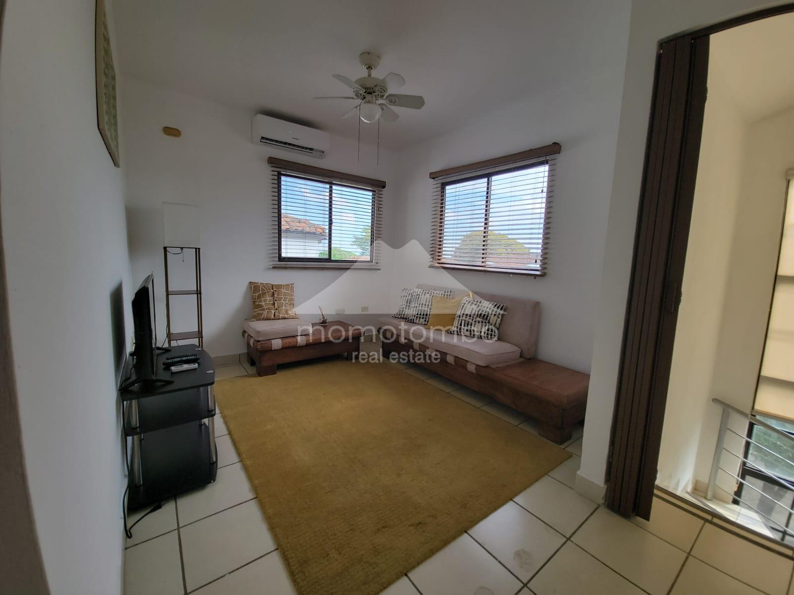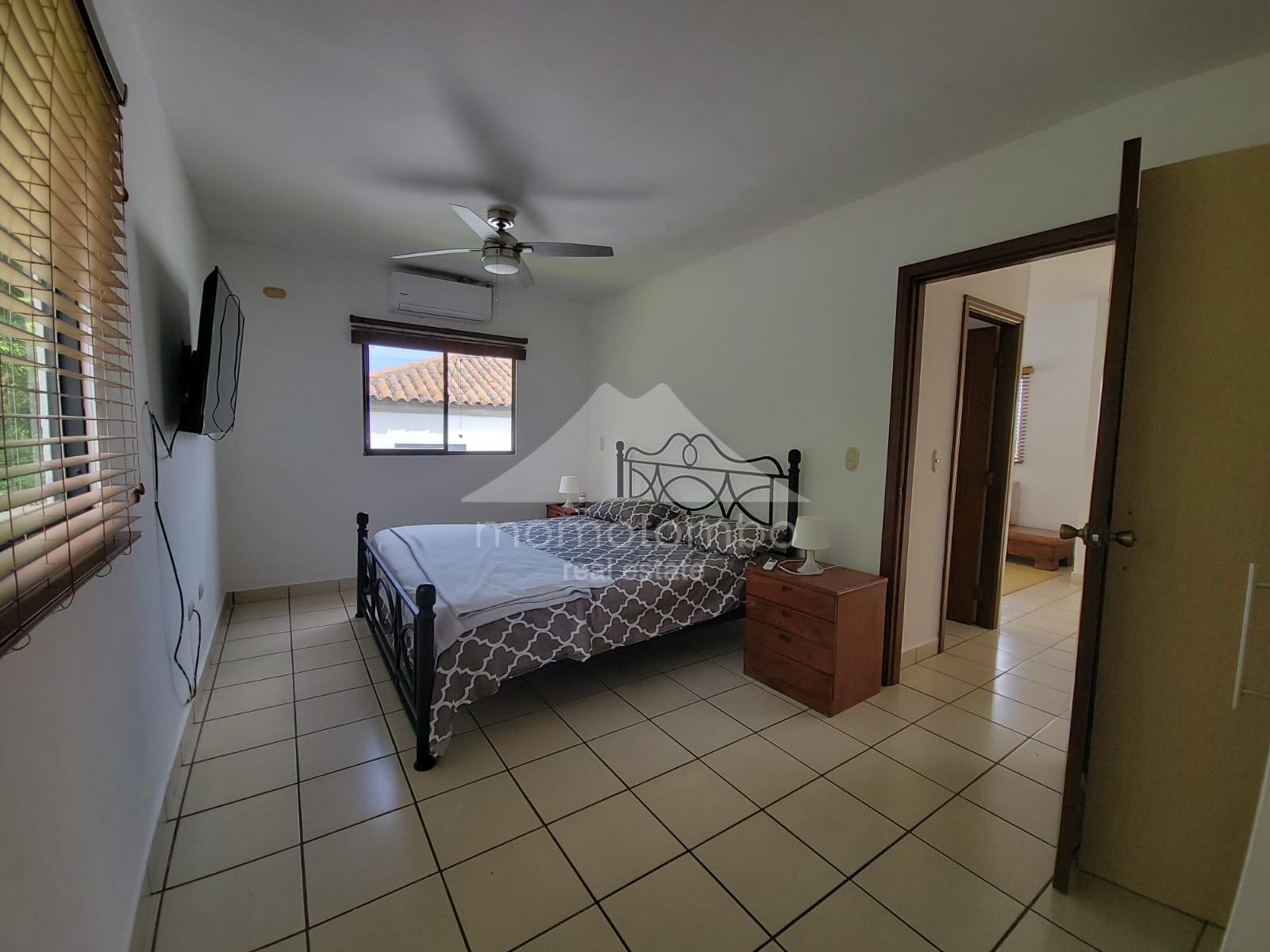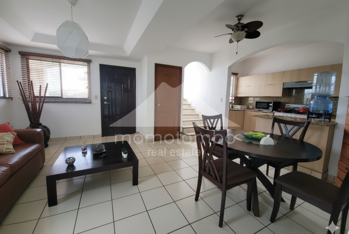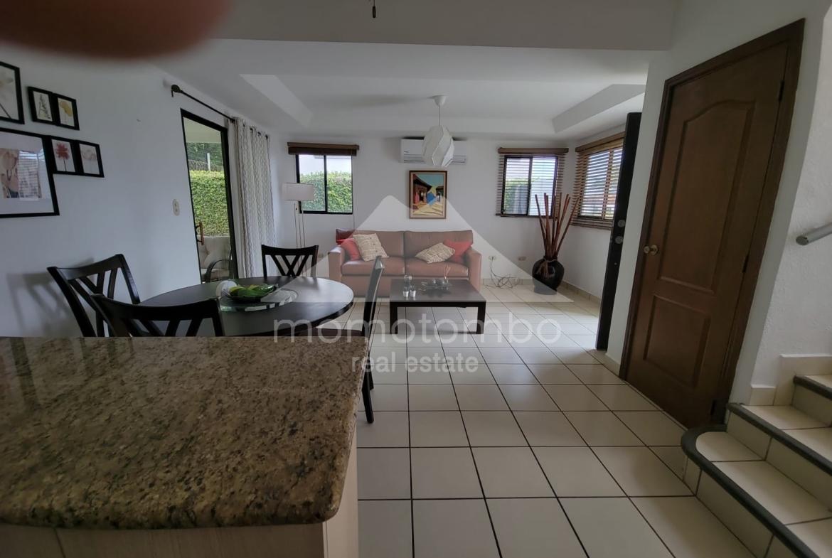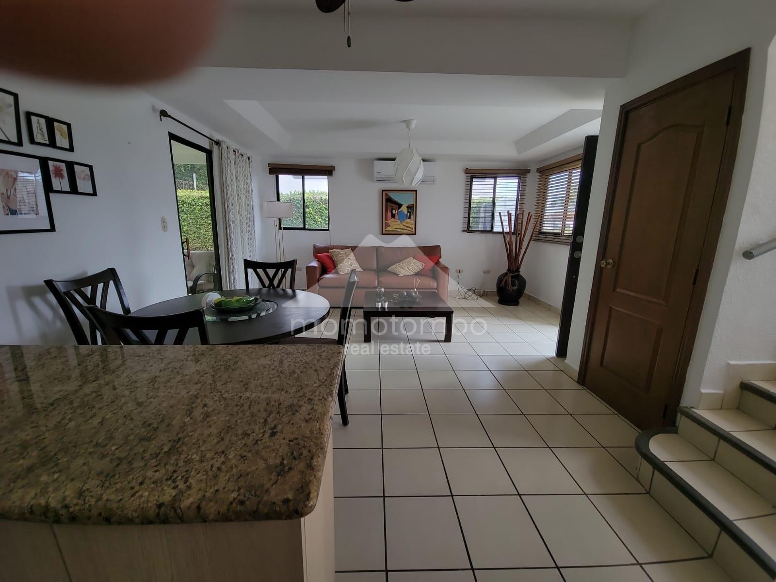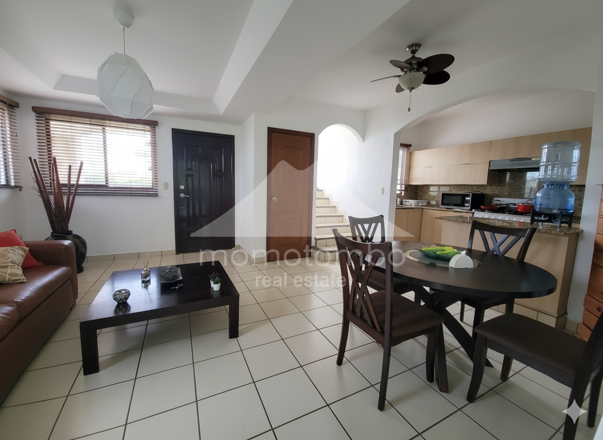 bonita casa de 2 plantas full amueblada, con acceso a piscina y área comunal, ubicada en condominio seguro y céntrico. posee 2 cuartos, 2 1/2 baños, sala-comedor, sala terraza, cocina, 2 terrazas, patio, jardín externo, área de servicio, estacionamiento, calentador de agua eléctrico, aires acondicionados, sistema de agua potable y línea telefónica. vigilancia las 24 horas.