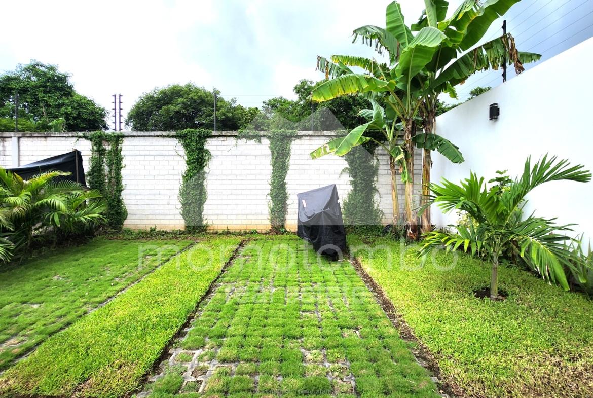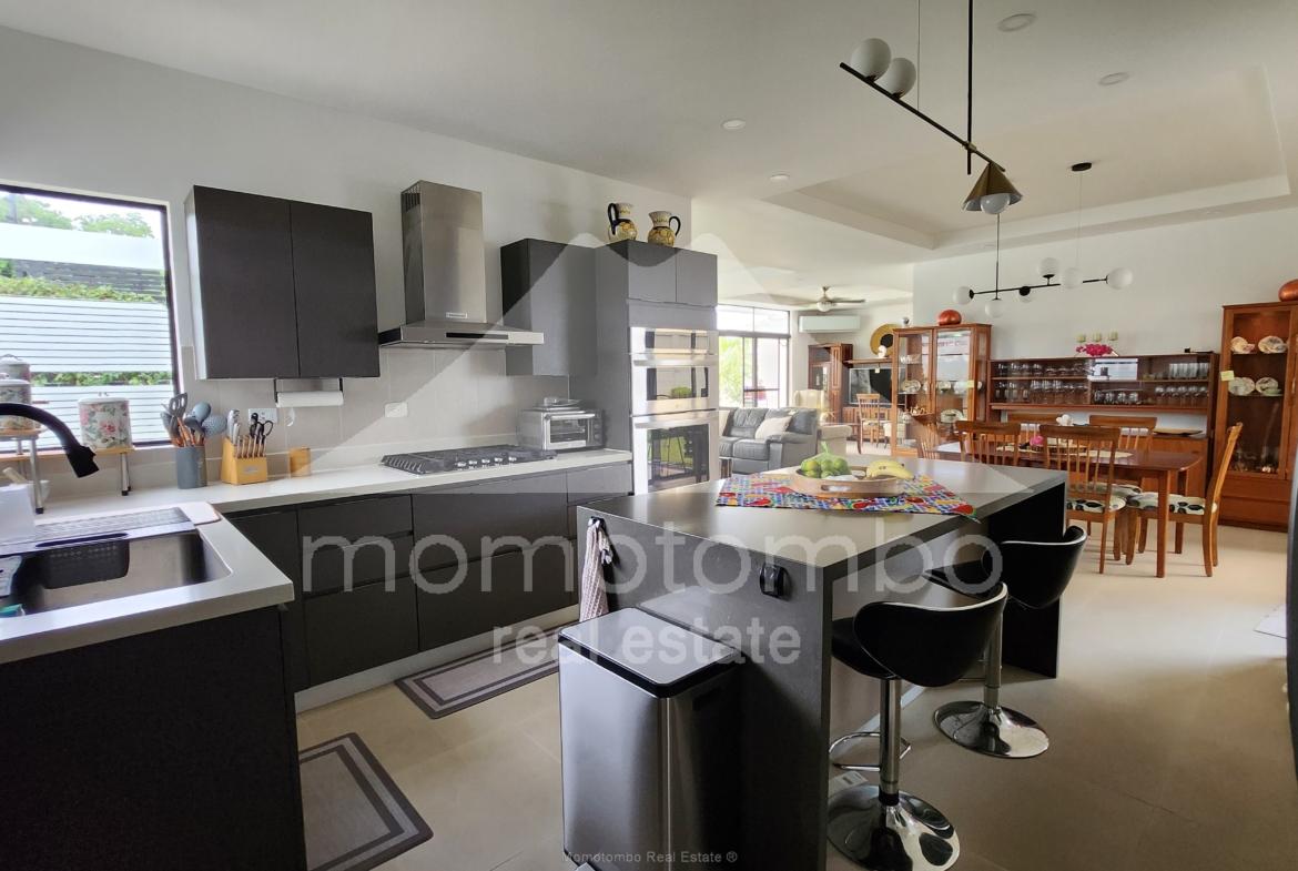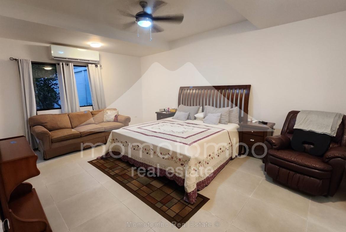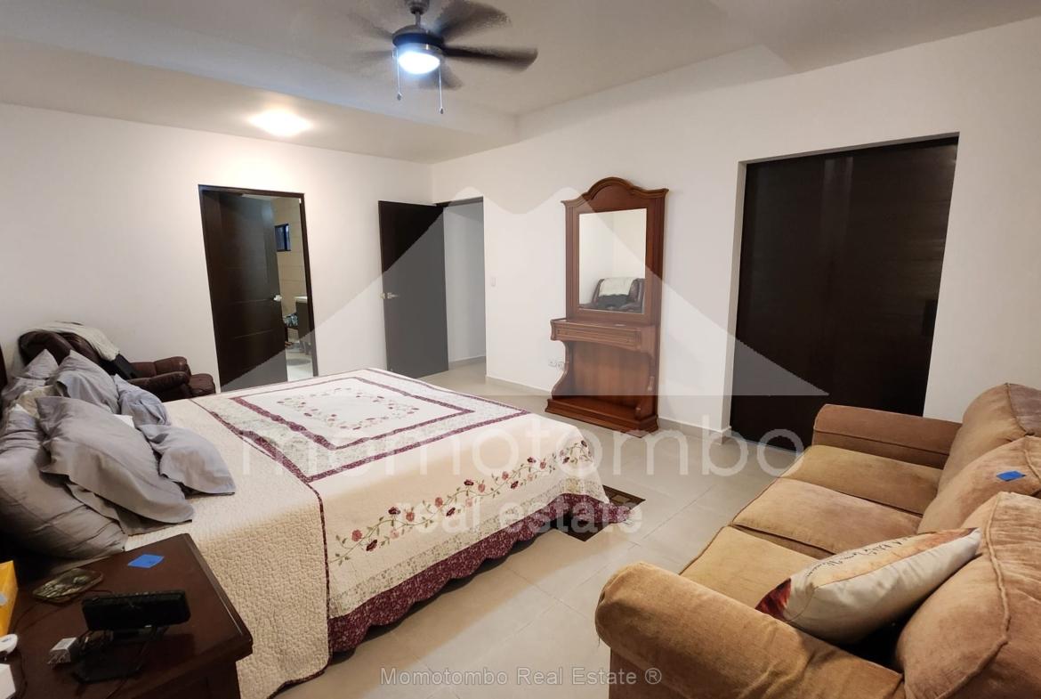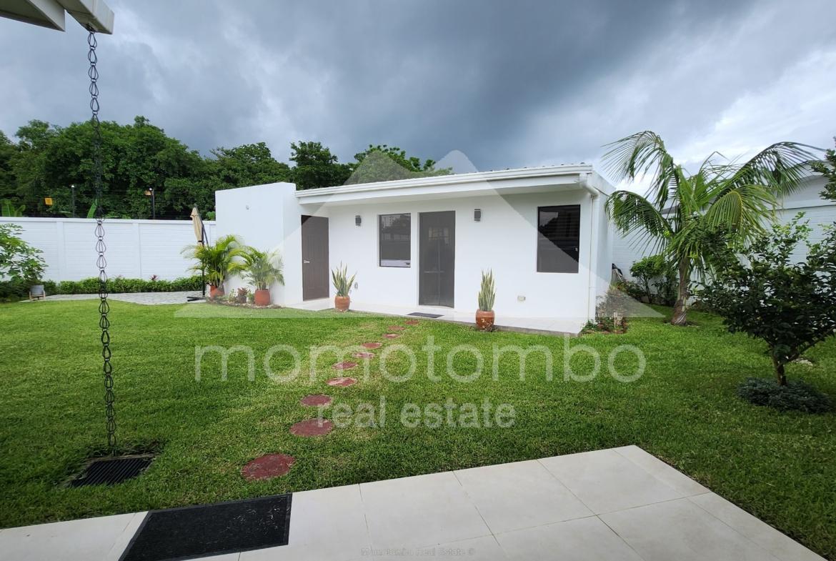 Hermosa casa de 330 m2 para estrenar, totalmente climatizada, a pocos minutos del centro de Managua, con terreno doble que totaliza 1012 vr2 en un residencial exclusivo con seguridad 24/7, cerca de supermercados, plazas comerciales y a pocos metros de la Carretera a Masaya. Cuenta con 4 habitaciones con sus closets, 2 baños, cuarto principal con amplio walk-in closet con diseño exclusivo para mantener todo ordenado, cuarto y baño de servicio, baño de visitas, 2 espaciosas terrazas con jardines, 12 paneles solares (incluido sistema eléctrico diseñado para distribuir la energía adecuadamente), cisterna con bomba hidroneumática, agua caliente y bodega. Adicionalmente, hay un apartamento con entrada independiente que mide 54 mt2 (baño y cocina-sala estilo estudio); bodega y estacionamiento para 3 vehículos. Cuenta con 6 aires acondicionados inverter. El área de cocina cuenta con isla, cocina empotrada, extractor de grasa, horno y microondas. área de lavandería techada, amplios portones y cerca eléctrica. Zona segura y exclusiva de Managua piscina comunal y area de recreación.