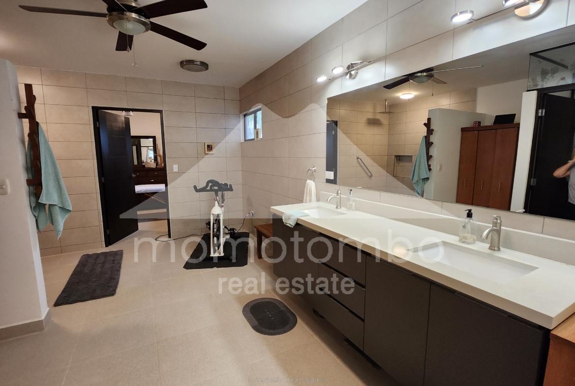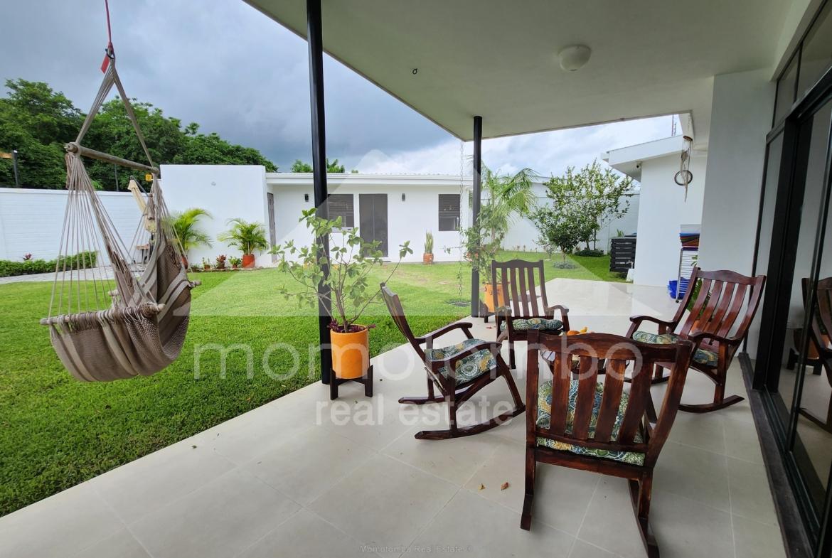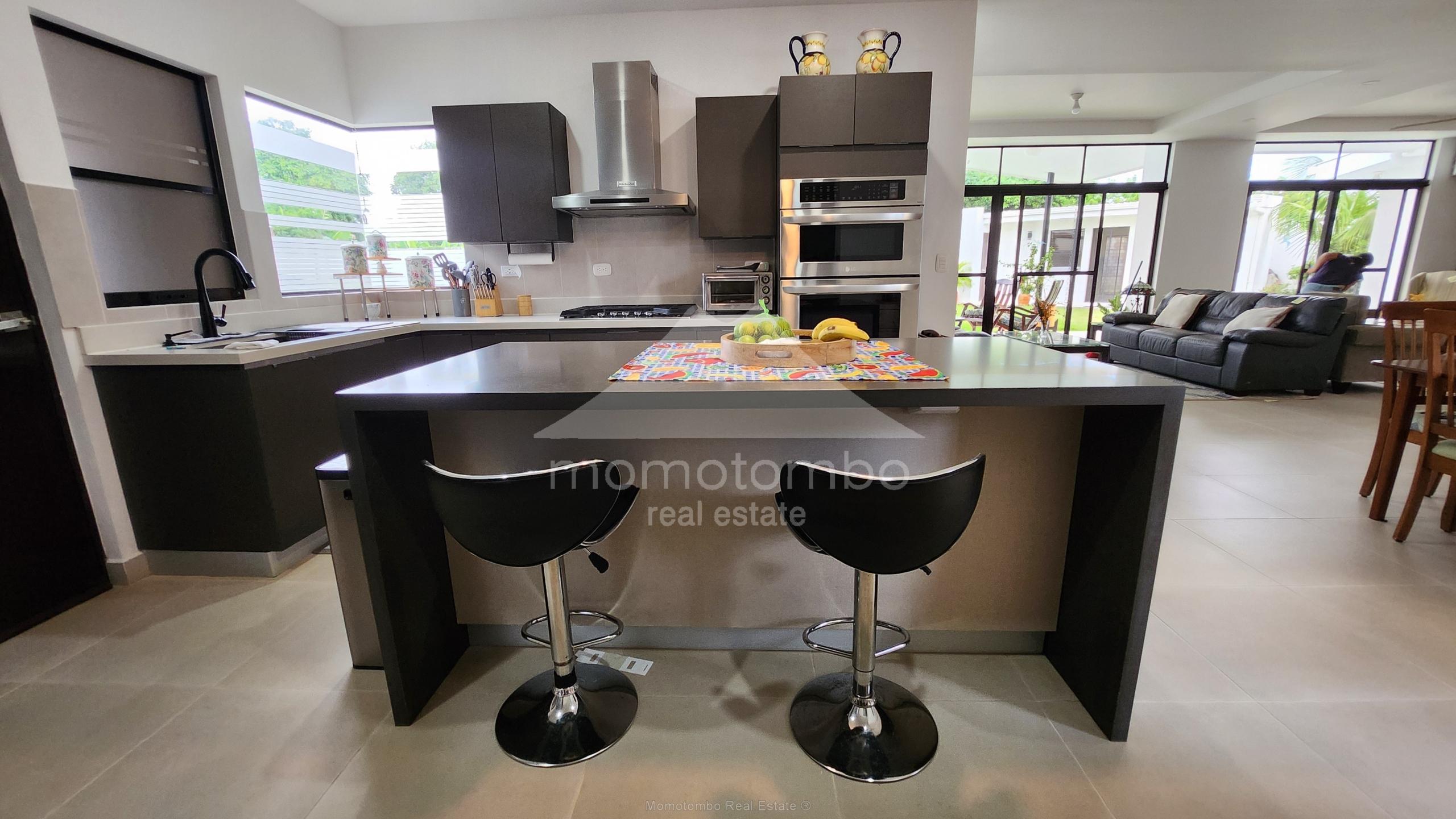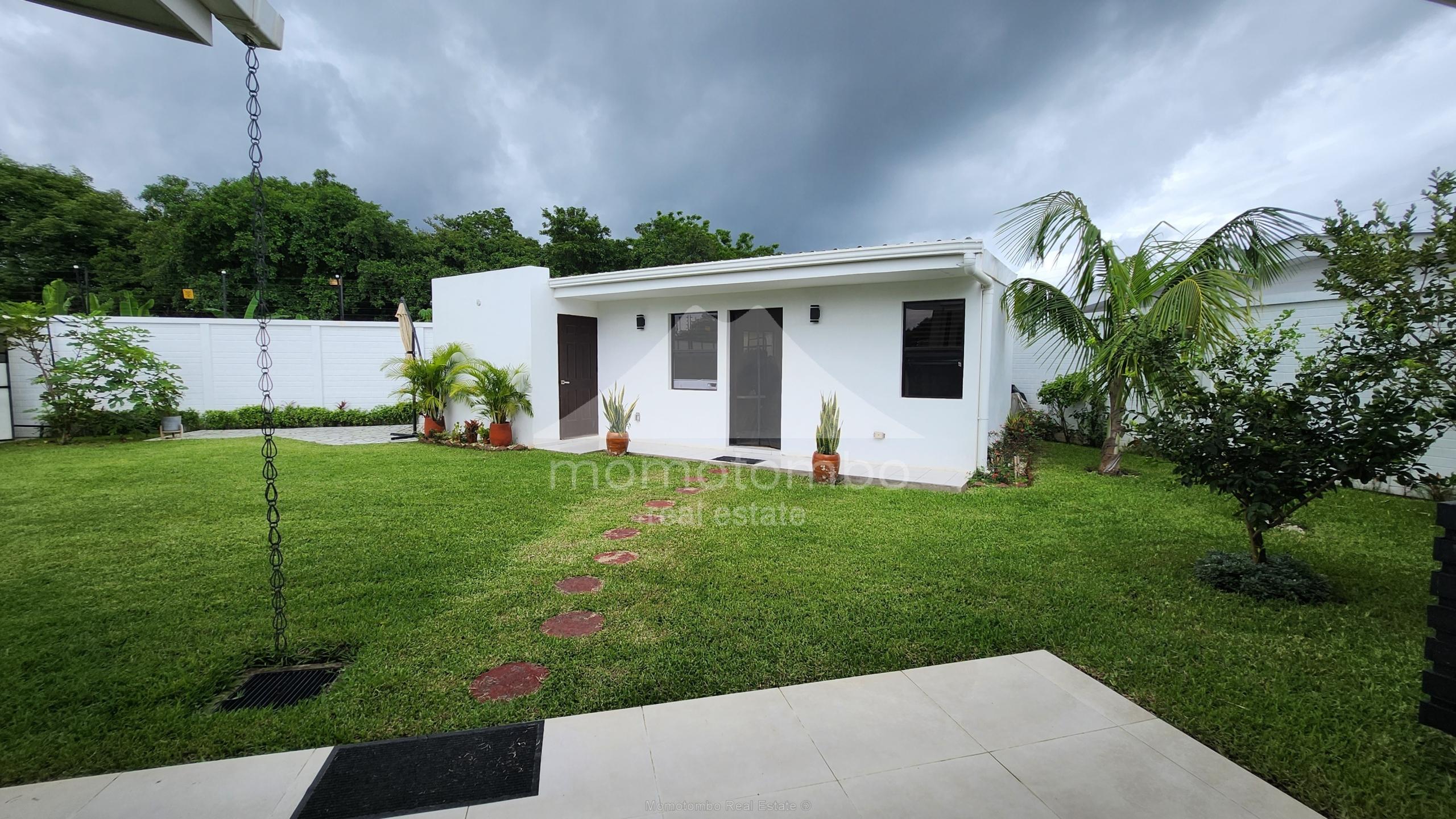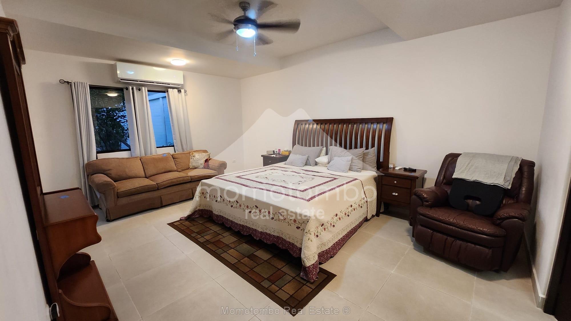 Hermosa casa de 330 m2 para estrenar, totalmente climatizada, a pocos minutos del centro de Managua, con terreno doble que totaliza 1012 vr2 en un residencial exclusivo con seguridad 24/7, cerca de supermercados, plazas comerciales y a pocos metros de la Carretera a Masaya. Cuenta con 4 habitaciones con sus closets, 2 baños, cuarto principal con amplio walk-in closet con diseño exclusivo para mantener todo ordenado, cuarto y baño de servicio, baño de visitas, 2 espaciosas terrazas con jardines, 12 paneles solares (incluido sistema eléctrico diseñado para distribuir la energía adecuadamente), cisterna con bomba hidroneumática, agua caliente y bodega. Adicionalmente, hay un apartamento con entrada independiente que mide 54 mt2 (baño y cocina-sala estilo estudio); bodega y estacionamiento para 3 vehículos. Cuenta con 6 aires acondicionados inverter. El área de cocina cuenta con isla, cocina empotrada, extractor de grasa, horno y microondas. área de lavandería techada, amplios portones y cerca eléctrica. Zona segura y exclusiva de Managua piscina comunal y area de recreación.
