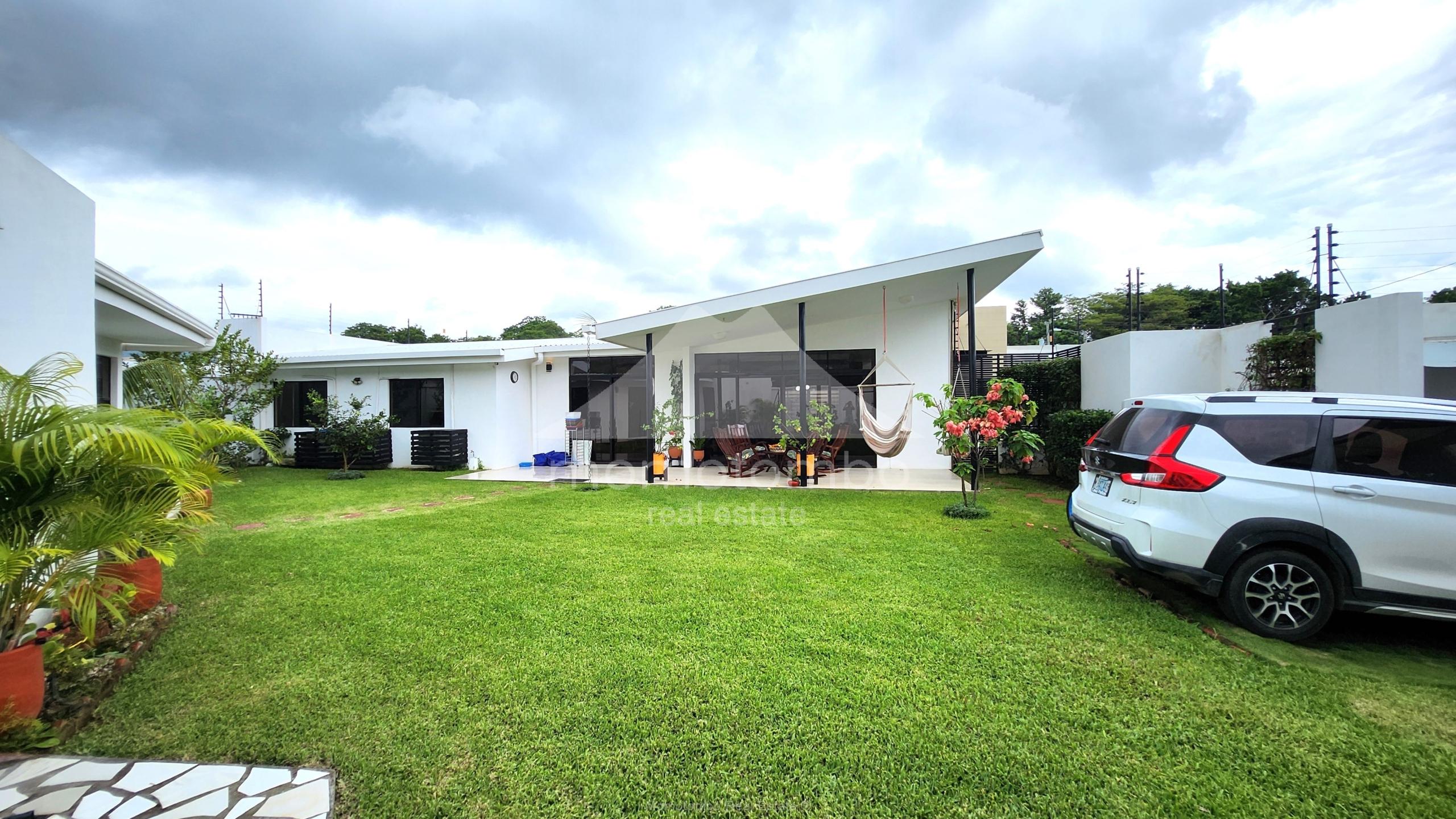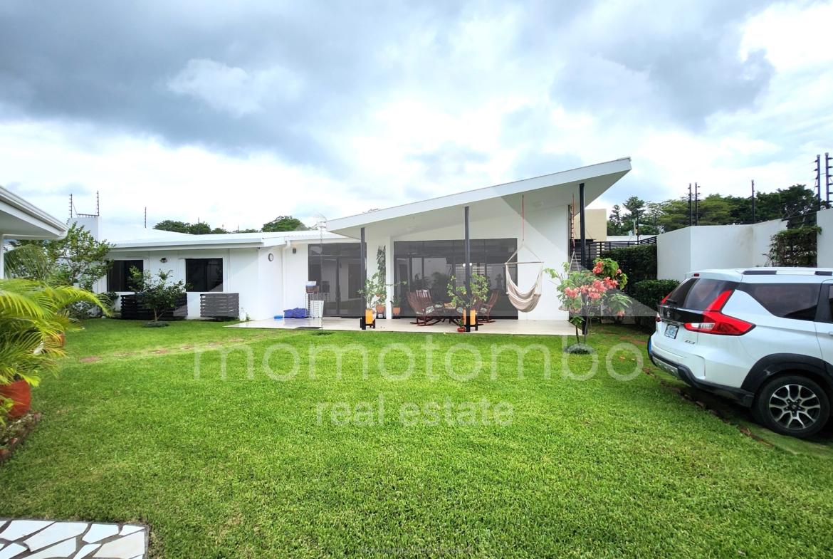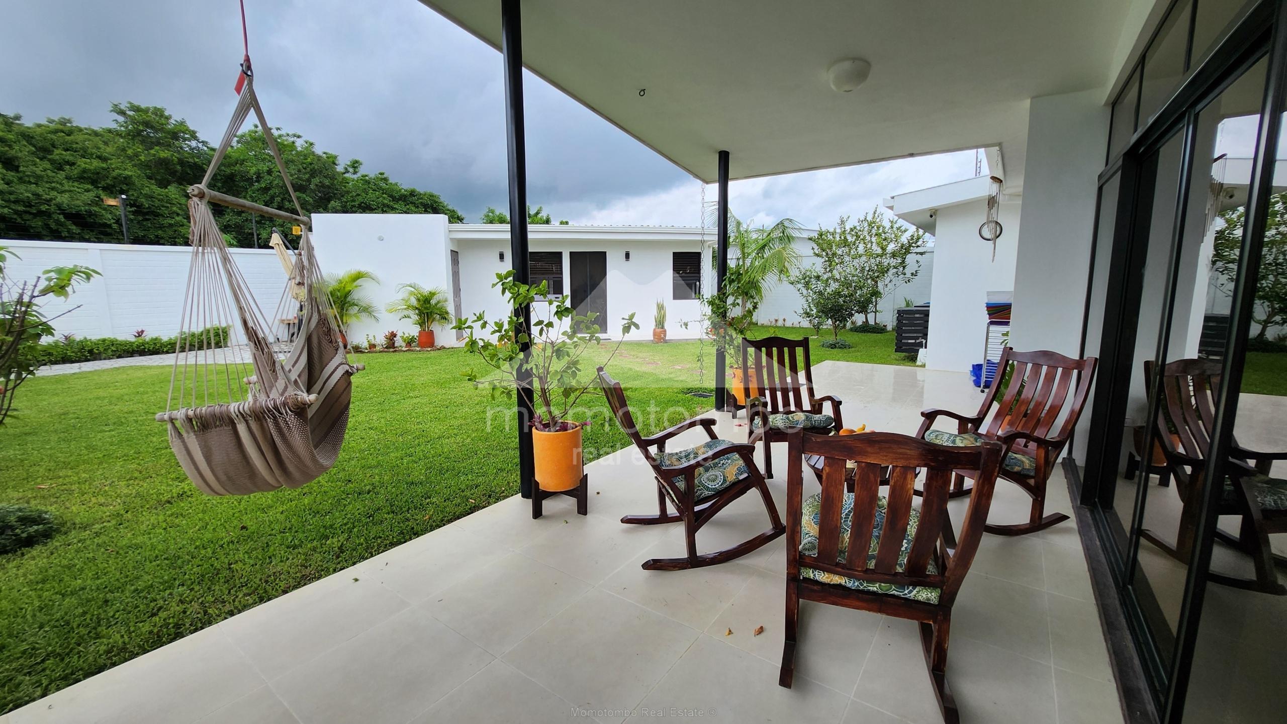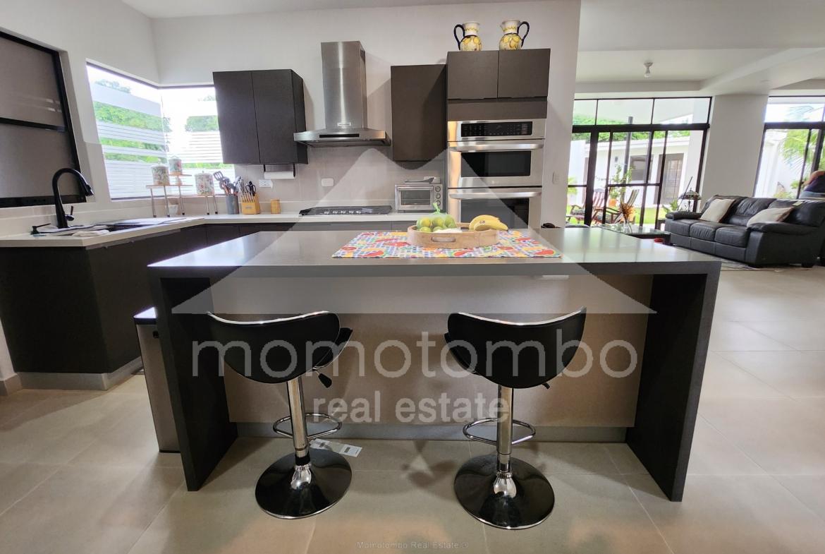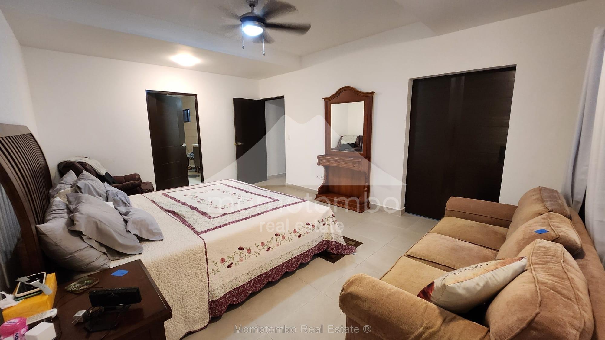 Hermosa casa de 330 m2 para estrenar, totalmente climatizada, a pocos minutos del centro de Managua, con terreno doble que totaliza 1012 vr2 en un residencial exclusivo con seguridad 24/7, cerca de supermercados, plazas comerciales y a pocos metros de la Carretera a Masaya. Cuenta con 4 habitaciones con sus closets, 2 baños, cuarto principal con amplio walk-in closet con diseño exclusivo para mantener todo ordenado, cuarto y baño de servicio, baño de visitas, 2 espaciosas terrazas con jardines, 12 paneles solares (incluido sistema eléctrico diseñado para distribuir la energía adecuadamente), cisterna con bomba hidroneumática, agua caliente y bodega. Adicionalmente, hay un apartamento con entrada independiente que mide 54 mt2 (baño y cocina-sala estilo estudio); bodega y estacionamiento para 3 vehículos. Cuenta con 6 aires acondicionados inverter. El área de cocina cuenta con isla, cocina empotrada, extractor de grasa, horno y microondas. área de lavandería techada, amplios portones y cerca eléctrica. Zona segura y exclusiva de Managua piscina comunal y area de recreación.