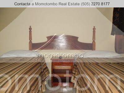 apartamentos en hotel para alquiler -reparto san juan -granada. cuenta con 12 departamentos bonitos y modernos apartamentos estilo bungalóws totalmente amoblados en elegante resort de granada, contienen 2 habitaciones con sus respectivos guarda ropa, tv-plasma, aire acondicionado en cuarto principal , abanicos de techo, un baño compartido y bonitos accesorios, sala-comedor, cocina, área de lavado, el inmueble cuenta además con huellas vehiculares, acceso a piscina, servicio de bar-restaurante disponible solo los fines de semana y está ubicado a pocos minutos del centro de la ciudad, renta incluye servicio tv-cable y seguridad 24h